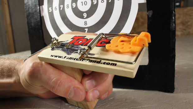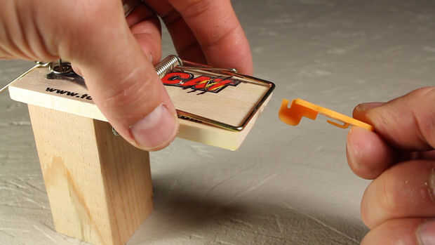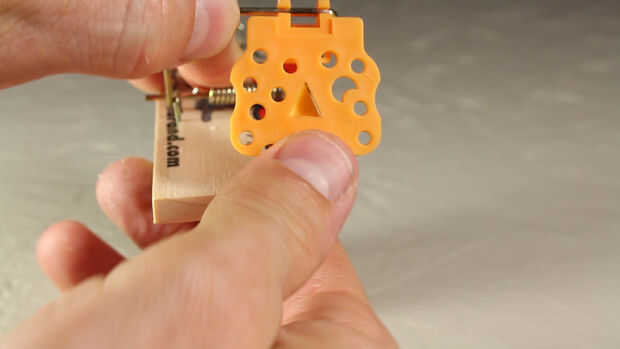 Con la trampa martillo relajado, clip el cebo cojín con los ganchos hacia arriba, luego cuidadosamente levante el martillo, meter el cojín debajo y relajarse el martillo hacia abajo sobre la base de la trampa.