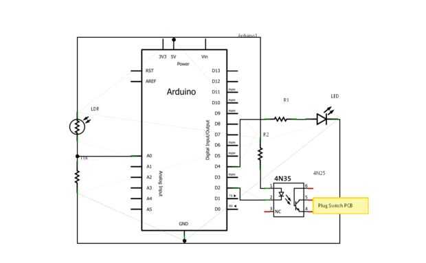 Dejar que el arduino controlar el enchufe sin tener que compartir terreno utilicé un optoacoplador 4N25. Dos patas se conectan a arduino y otros dos para el enchufe.