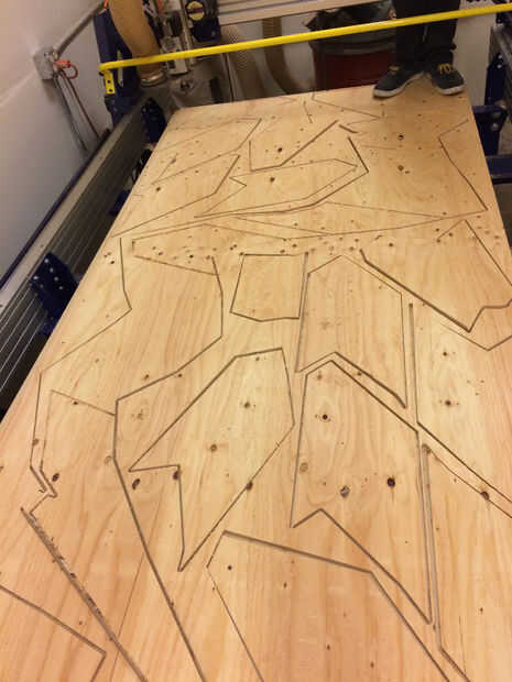 Una vez que el modelo final "listo para ir", se utilizó otro plugin grasshopper, RhinoNest para organizar el modelo en una serie de láminas que encajan en nuestras hojas de madera contrachapada estándar 4' - 0" x 8' - 0". Experimentamos con la forma de organizar la anidación. Consideramos el modelo como un todo, cada media luna por separado y el modelo como por terceras partes. Debido a limitaciones de tiempo, materiales y económicos, hemos decidido anidar el modelo como un todo en las hojas. Mucho como corte de galleta, hemos optimizado los anidación ajustes para reducir al mínimo la cantidad de material desperdiciado tanto como sea posible.