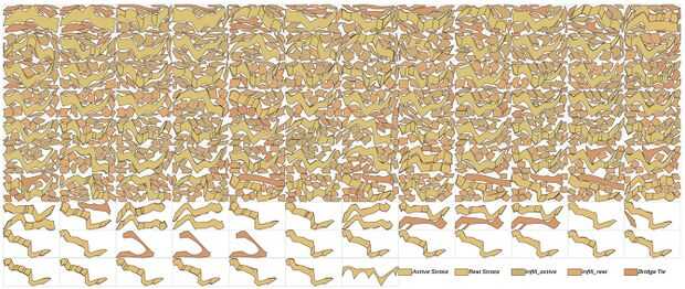 Con el diseño general bien desarrollado, la última fase del diseño consistió en preparando el modelo para la fabricación. En esta etapa, tuvimos un buen grupo de voluntarios que estaban dispuestos a ayudar. Preparando el modelo para la CNC molino resultó para ser un montón de pasos manual. Hemos trabajado sobre cómo organizar el modelo de fabricación. Nos decidimos por 5 diferentes clasificaciones: estrato activo, resto estratos, relleno activo, resto relleno y lazos transversales que unen ambos Crescent. Con 1500 + componentes únicos, el objetivo fue poder organizar rápidamente las piezas como salió de la fábrica y ser capaz de ordenarlos en un sistema racional.