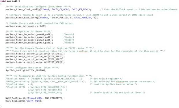 Usted notará que hay un bloque de código que se refiere a un sistema de pizarra. Esta pizarra es un temporizador interno que se puede utilizar para desencadenar eventos a intervalos regulares. Lo uso para actualizar la velocidad de mis motores cada 10ms. El ESC sólo recibe una nueva anchura de pulso cada ms 21, por lo que la actualización de 10 ms velocidad debe siempre ser en tiempo de actualizar el PWM de salida.