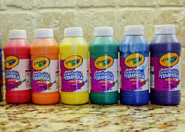 1. Llene las botellas de spray con la pintura de témpera lavable. No trate de usar pintura de brillo. Lo hicimos, y que inmediatamente obstruido la botella del aerosol. Agregue el brillo al final si es necesario.