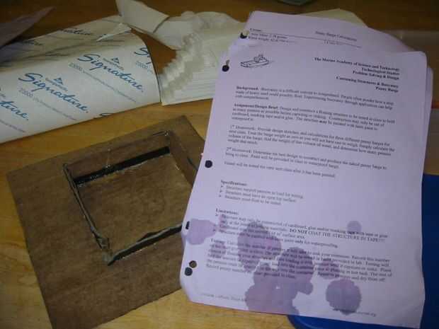 Breve de asignación/diseño: diseño y construcción de un envase de cartón flotante con 144 pulgadas cuadradas o menos de superficie para sostener tantas monedas como sea posible antes de zozobra o de hundimiento. Contenedor de capa con una capa de cinta adhesiva en el exterior con resistencia al agua.