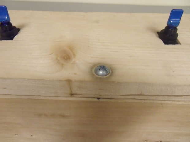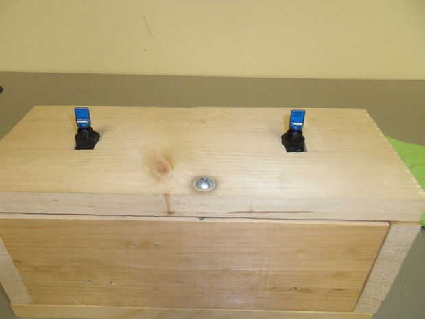1) en la pieza superior, recortas dos agujeros rectangulares para los interruptores que corté con una sierra de contornear. Puede ir prácticamente en cualquier lugar pero se ven bonitos a unas 3 pulgadas de cada lado y 2.5 pulgadas de la delantera y trasera. También tengo un agujero circular en la parte delantera que uso para mantenerlo cerrado con un tornillo corto. Me gusta este "cierre" porque es fácil de quitar con un destornillador, pero puesto que la mayoría de las personas no portan un todo, la caja permanece cerrada.