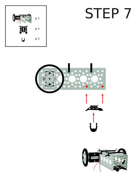 7. Inserte el accesorio de la rueda en el agujero rectangular en el montaje de la rueda. Encaje la pieza resultante en la parte inferior del canal en los agujeros indicados. Orientar la pieza para que el sensor cuadrado monta cara lejos del canal tal como se indica.