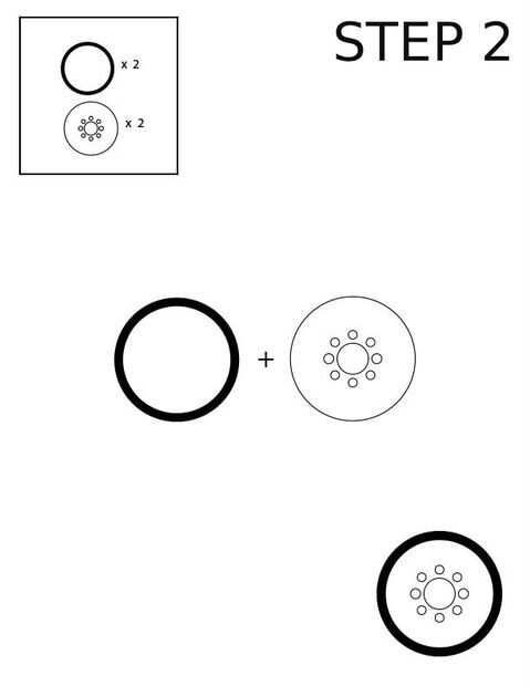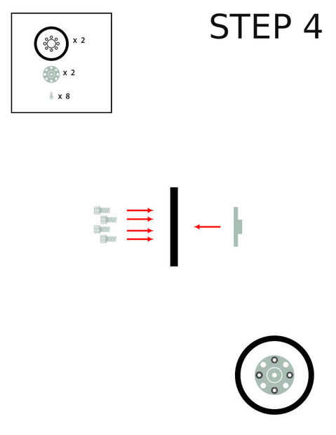 4. Cuatro tornillos a través de cada rueda y en los orificios roscados de la alimentación del tornillo de fijación del cubo del otro lado. Asegúrese de que las caras del tornillo de la rueda.