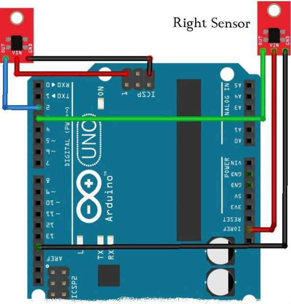 Conecte el sensor de reflectancia adecuada con la mujer a los cables del puente masculino. Conecte la entrada de 5V (VIN) del sensor derecho al pin IOREF en el Arduino, el pin GND del sensor a GND de Arduino y un pin del sensor digital de contacto 3 de Arduino.