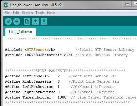 4. Abra el ejemplo Line_Follower y los #define ThreshHoldVal a aproximadamente el valor medio entre las lecturas del sensor de luz y oscuridad obtenida en el ejemplo de Sensor_Values. Para una configuración típica es generalmente alrededor 1000.