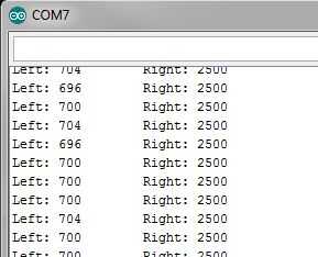 3. Cargar y ejecutar el ejemplo mientras se mueve cada sensor sobre las partes claras y oscuras de la línea siguiendo la pista. Anote los valores claros y oscuros de cada sensor.