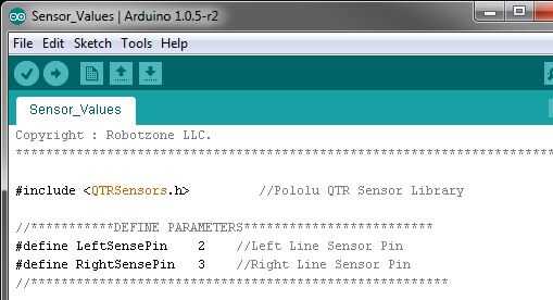 2. Abra el ejemplo Sensor_Values. Asegúrese de que el #define LeftSensePin y # definen a partido de valores RightSensePin los pines correctos en el Arduino.