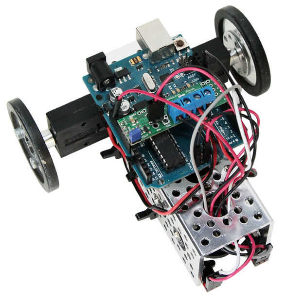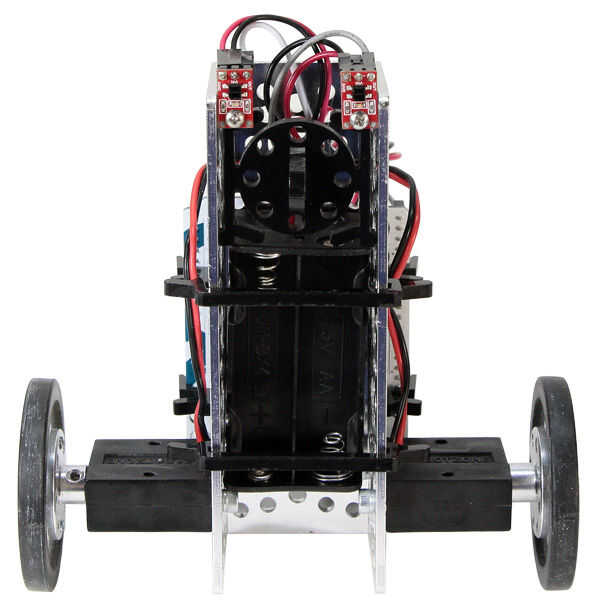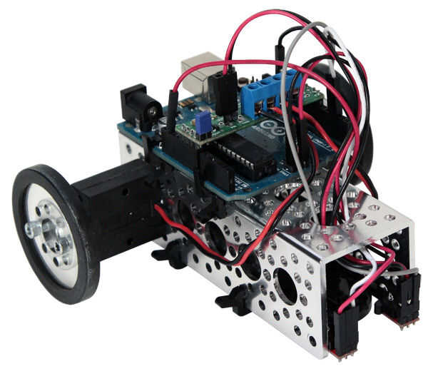 Este robot utiliza un algoritmo de control PID para seguir autónomamente un camino negro sobre un fondo blanco. Utiliza una matriz de ocho sensores de reflectancia IR para determinar la posición del robot en la línea, y el microcontrolador Arduino Na