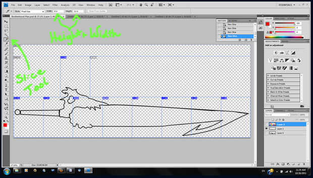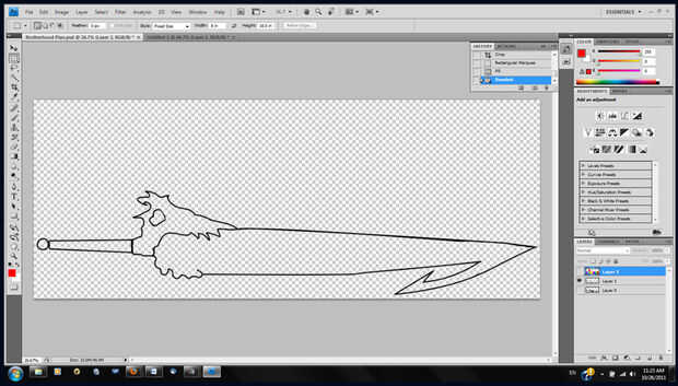 Con Hermandad, como ya he dicho, el arte ilustrado de Tidus es realmente más útil debido a la línea recta en ángulo del plano. Empezar por borrar ese diablo guapo. Él está distrayendo, y sólo queremos que la espada. Gire por lo que es horizontal (se puede ir vertical también, si eres raro). Crear una nueva capa y copiar todas las líneas importantes. Fácilmente pueden seguir los contornos a través de pata de Tidus. Luego, deshacerse de las ilustraciones originales por detrás así que sólo te queda con sus líneas.