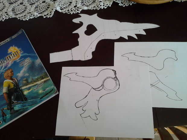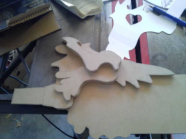 Después tuve mis patrones a MDF usé mi sierra de calar para cortar las piezas individuales. Corte trata de hacer la forma de la pieza más fácil. Arte sustractivo es siempre más difícil que el añadido. Mediante la separación de la pieza en capas usted puede construir, en lugar de esculpir hacia abajo. Darle forma cada capa como agregarla. Aquí se puede ver cómo las capas de esta espada se apila para arriba (sin cualquier forma) y ya puede ver la forma final que se supone que terminan siendo.
