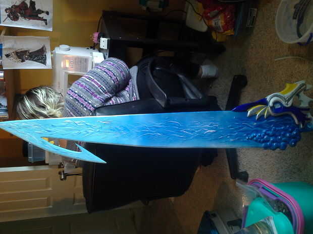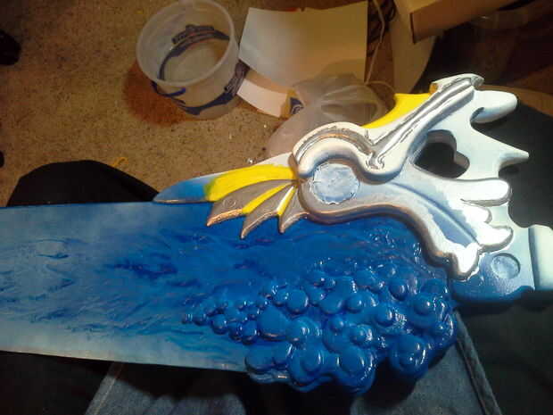 Después de las capas de imprimación y lijado de algunas, apliqué dos blues. El azul más profundo iniciado cerca de la manija y se descoloró hacia fuera apenas un poco más allá del punto a la mitad de la hoja. El Celeste empezó en la punta y rociaron un gradiente justo más allá del borde del azul más oscuro. Después de esto, todo estaba pintado a mano. La hoja en particular tiene una gran variedad de lavados más oscuro y entonces algunos seco cepillado de blancos y verdes azul claros en la parte superior.