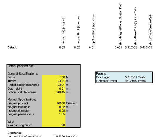 Solidworks viene con esta característica muy útil llamada una tabla de diseño. Es una hoja de excel extensión que pueden y en este caso, contiene un montón de ecuaciones que impulsan el diseño. Para abrir la hoja de cálculo - ya sea en excel o en solidworks - y en la zona de hightlighed amarillo, entrar en los parámetros pertinentes: deseado fuerza, tiro, distancia lateral y fuerza de imán/geometría.