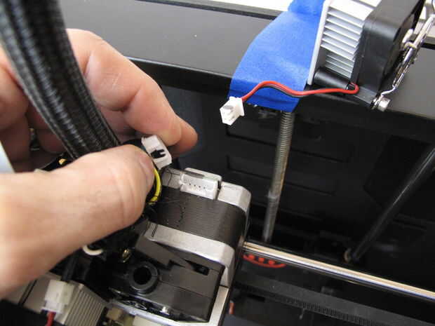 - Desenchufe el conector del cable del ventilador y el conjunto en la parte derecha trasera de la impresora 3D de la cinta. De esta manera usted no pierde.