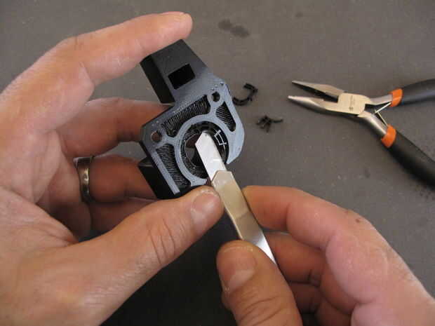 El archivo STL para la base tiene un soporte material. Está diseñado con un espacio de aire que hace que sea fácil de quitar. Simplemente puede usar un par de alicates de pico y un cuchillo.