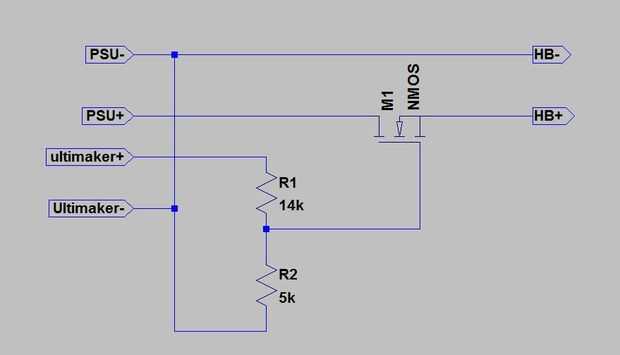 Aquí estamos utilizando el mosfet como interruptor controlado por la terminal de tornillo de salida de la ultimaker. Creo que yo podría simplemente conectado el terminal positivo directamente a la puerta del mosfet, como en mi caso debería haber sido capaz de manejar la salida de 19 voltios ultimaker suministrado, pero en su lugar decidí reducirlo usando un divisor del voltaje en el lado seguro. Para ello utilicé una combinación de la serie de resistencia k 14k y 5. Esto trajo el voltaje de la puerta de abajo a alrededor de 5v que sentí fue un nivel más cómodo y sería suficiente para asegurarse de que el mosfet completamente encendido cuando estaba destinado a ser.