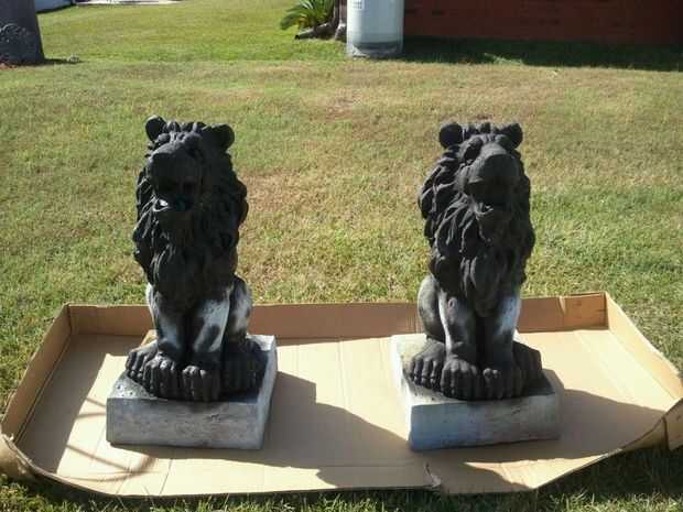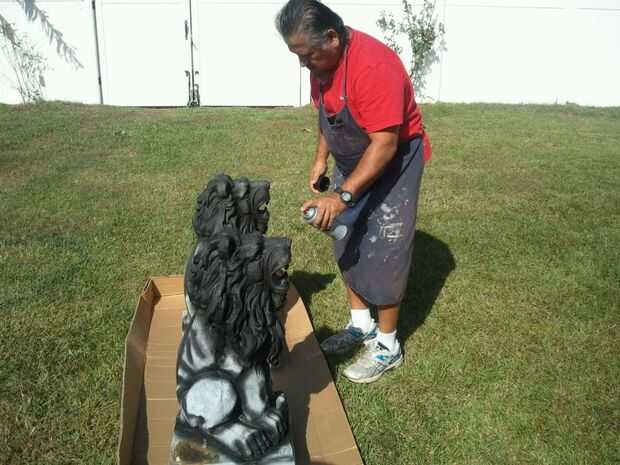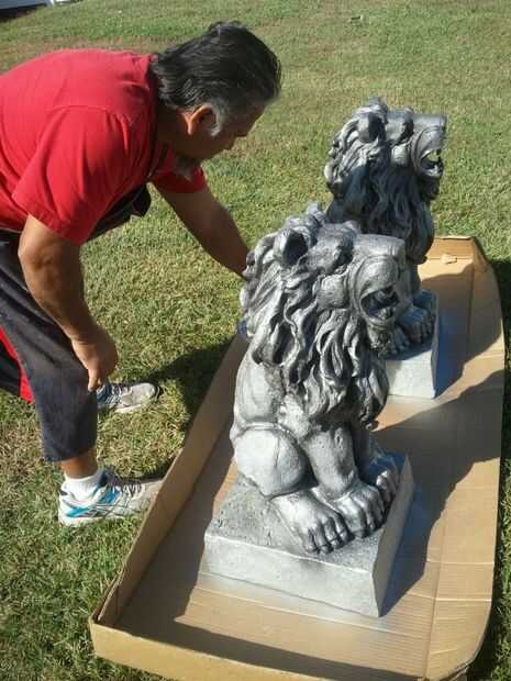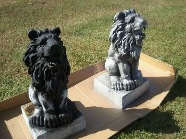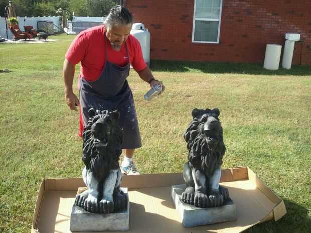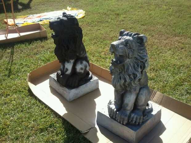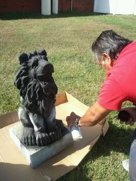 Me mudé a los leones de donde estaban sentados en los caballos de la sierra hasta la hierba por lo que podría golpear la parte superior de la cabeza mejor. Una vez que el negro estaba secado empecé con un plata metalizado también pintura en aerosol Rust-o-leum. He rociado y trató de golpear a las áreas que sacó frente a las grietas y zonas de sombra. Cuando sea necesario mencioné arriba el negro para las altas y bajas de todo mezclado en.