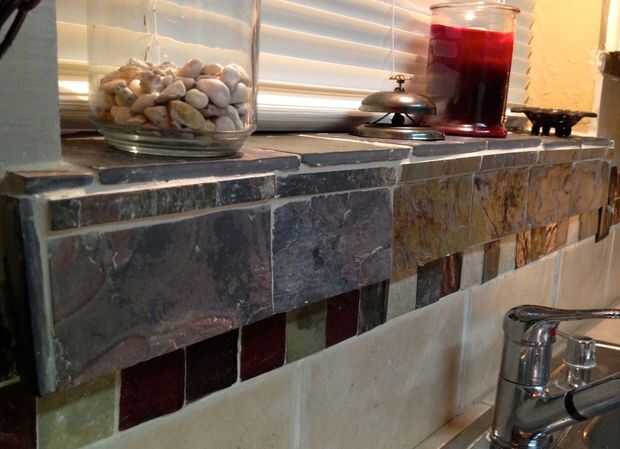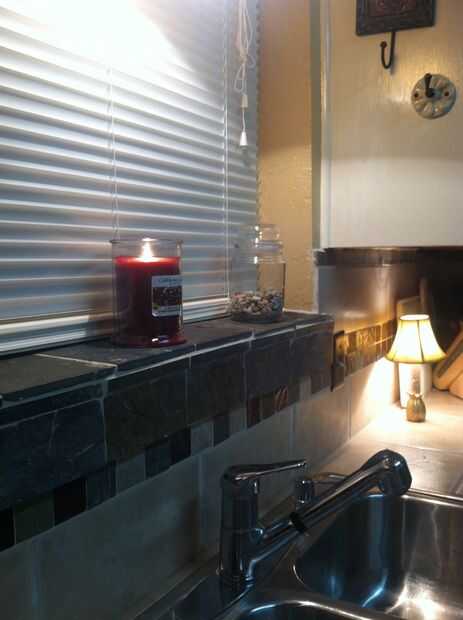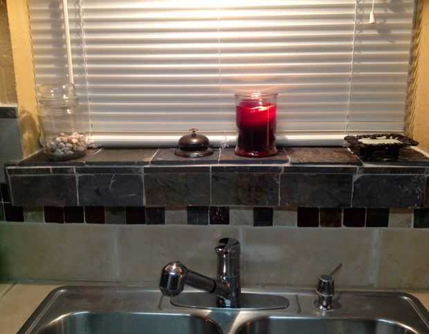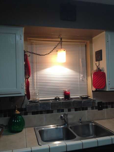 El alféizar de la ventana era simplemente madera pintada. Decidí darle carácter mediante la adición de una pequeña madera para construir la parte inferior del travesaño de la ventana y azulejo de la pizarra agregando a él. Tengo pensado hacer lo mismo en algunos otros inferiores travesaños de la ventana que mi cachorro gran danés recientemente ha masticado a pedacitos! La luz pendiente fue uno que cablear con un cable de extensión. Tejió la extensión a través de una cadena que aerosol pintado con la pintura en aerosol cobre antigua y atado con alambre (después corté el final de curso) un zócalo del bulbo de reemplazo para crear un colgante ligero de la piedra colgante comprado en Lowes en liquidación por $8.00.