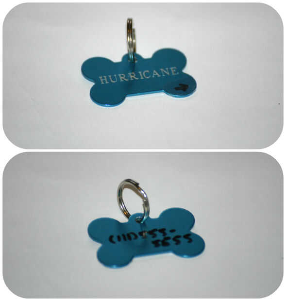 Utilizar el marcador permanente en la parte posterior de la etiqueta para escribir información nueva. También hice una flecha en la parte delantera para referirse a alguien a la espalda. Etiqueta actual de mi perro la línea crucé apagado en el frente que se convirtió en una flecha, para una mayor referencia visible.