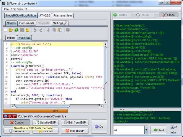 esplorer es un programa hecho especialmente para esp8266 wifi module.you puede cargar código de lua o en comandos en el esp8266 mediante el uso de este software.