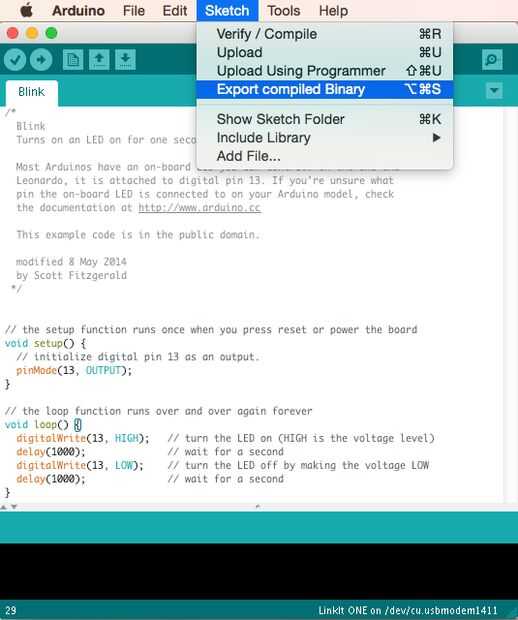 Abra el IDE de arduino y empieza la codificación! Al terminar, haga clic en dibujo en la barra de menú y seleccione exportación había compilado binario a exportar el archivo .hex .