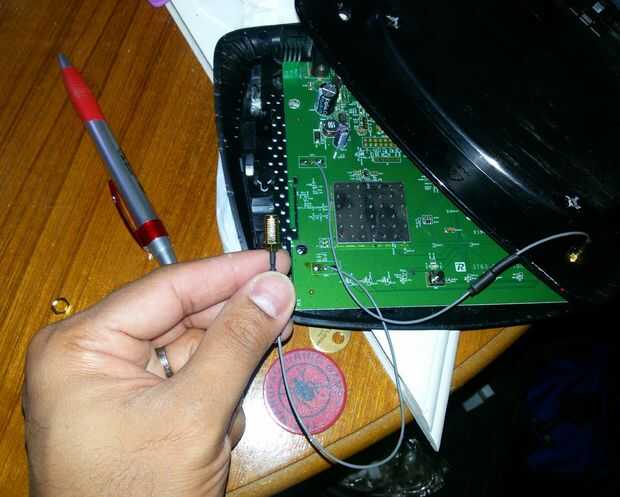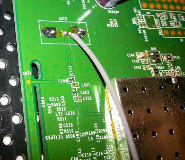 Por desgracia mi router no se conecte conectores coaxiales. Había soldado los dos conectores hembra a la Junta. El escudo va a tierra y el conductor interior va hasta el punto de soldadura ANT.