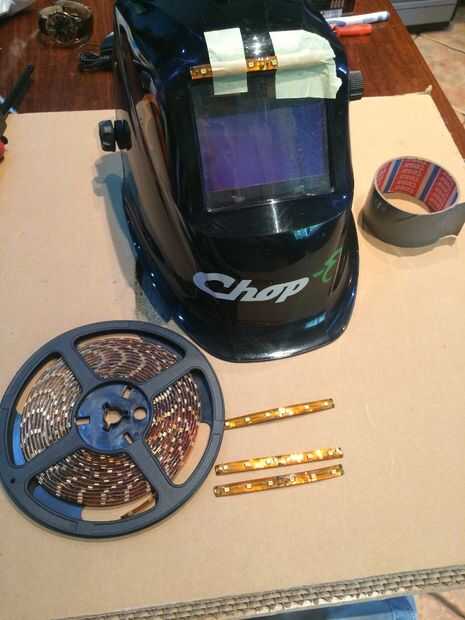 Cada vez que tengo que soldar en baja condición de luz corro en problema del "lado oscuro": D especialmente si extra-fuente de luz es demasiado grande para caber en lugares apretados o no hay luz adecuada ni extra. Así que tuve una idea para poner algunas luces en mi casco de la soldadura. Por alguna razón lo no hice en mi taller, pero en casa sin necesidad de un taladro: P