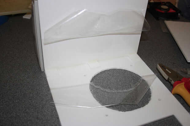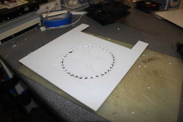 Antes de pegar las dos secciones que corte un gran agujero para montar el ventilador en y una brecha para los puertos de la entrada-salida de la placa base. Usé pegamento para unir las dos secciones y luego epoxy resina para reforzar la articulación.