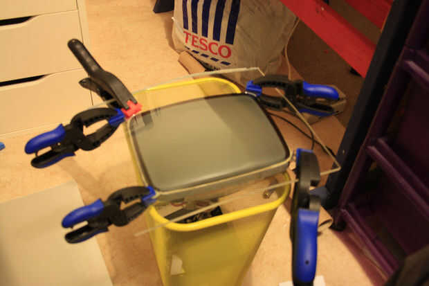 Una vez que está cocido el plexiglás, coloque cuidadosamente sobre el CRT, el plexiglás será caliente, así que ten cuidado, ayudará a usar guantes. Sujete el metacrilato hasta su enfriamiento, usé pinzas para sujetarlo a la CRT.