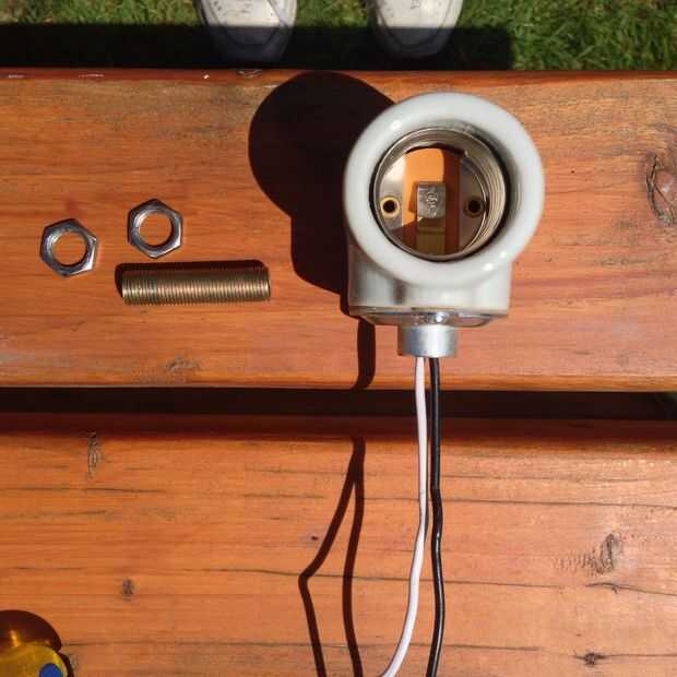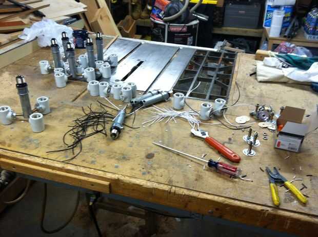 • 3 doble porcelana lámparas zócalos con brida manguitos y cables - utilizamos porcelana como esperábamos sería más durable y no agregó mucho al peso. Llegamos con un solo par de cables (es decir, usted no puede controlar cada lado de la lámpara por separado) para reducir el número de cables que tendríamos en el conducto.
