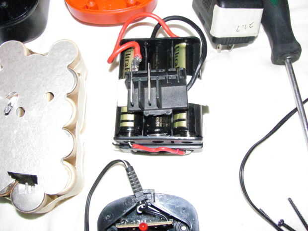 Entonces construí un paquete de células de ion de litio seis 18650 tamaño 3.7v en serie. Las células se llevan a cabo en dos resorte plástico 3 paquetes que se conectan en serie con un cable soldado entre ellos [el cable rojo en la segunda foto]. 6 celdas en serie a 3,7 22.2v el pack nicad cuando completamente cargado es 21.75v las células de litio están protegidas con un chipset pequeño en el extremo negativo. Así pueden ser cuidadosamente soldadas, pero no puedes soldar. Los paquetes de resorte elimina la necesidad de cualquier célula de soldadura y si un celular sale mal, es muy fácil de reemplazar la célula mala.
