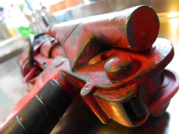 El barril y manija gris oscuro pintado a mano, luego utiliza algunos pintura negro mate acuosa que pongo en algunos de los huecos y rincones, con una esponja para que se vea más orgánico y sucio. Luego hizo algunos muy acuosas marrones, verdes y rojos y usa una esponja para dar la apariencia de suciedad, barro y suciedad. Tenga cuidado de no excedernos en este paso, es un error muy fácil de hacer. Finalmente utilicé algunos pintura plateada y con sólo una cantidad muy pequeña en mi pincel fui suavemente los bordes de las piezas negras para dar la impresión de metal desgastado. Esto es particularmente eficaz en la barra.
