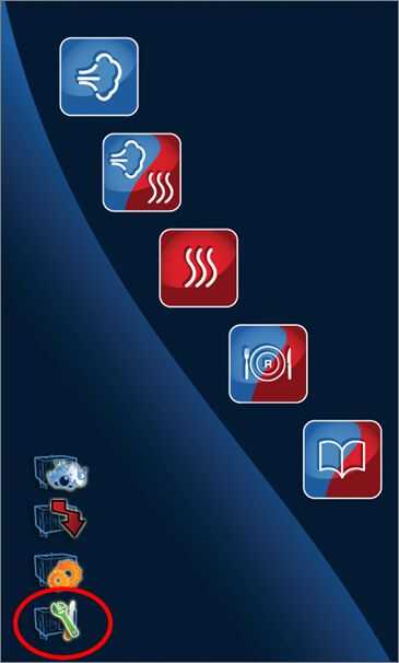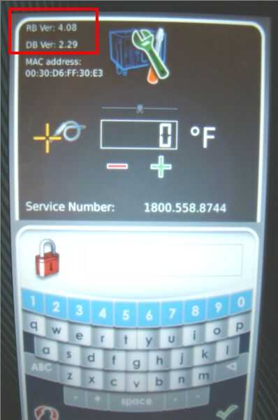 Ahora quieres verificar el software ha sido aceptado.  Toca el icono con la llave y destornillador.  La versión de software se encuentra en la esquina superior izquierda. (RB = placa de relé / DB = tablilla)