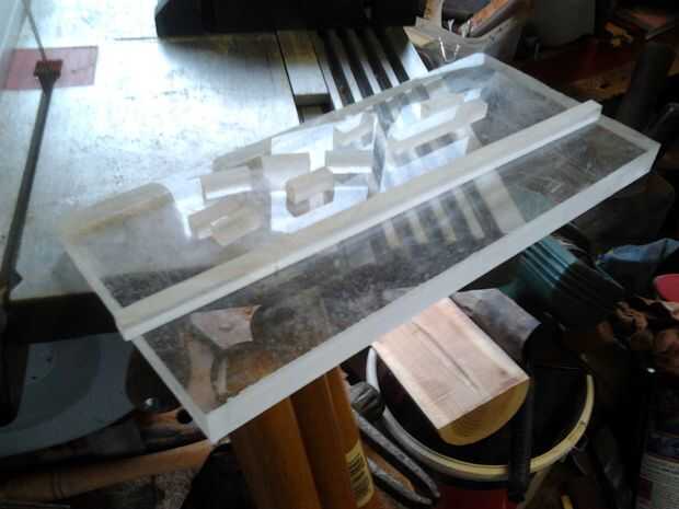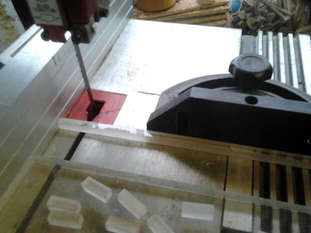 Corté unos 5 x 5 mm cuadradas tiras de una hoja de scrap de acrilico de 12 mm que tenía por ahí en el cobertizo. Usé la Sierra de cinta para sierra el acrílico a la medida. Entonces corté 6 piezas largas de 18mm de la tira de 5 x 5, las piezas donde alisado sobre un papel de lija de 240 grano y tenía un ir en llama pulido de las piezas para hacerlas ver a través de otra vez mi intento era pasable pero lamentablemente no perfeccionar la técnica hasta que después tuve este proyecto terminado.