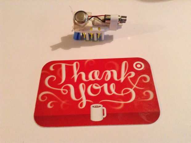 Para esta versión barredora necesita una vieja tarjeta de regalo o tarjeta de crédito y un TinyBot (yo usé BrushyBot). También desea una pistola de pegamento caliente y un buen par de tijeras o cortadoras.