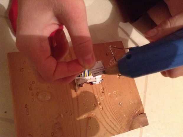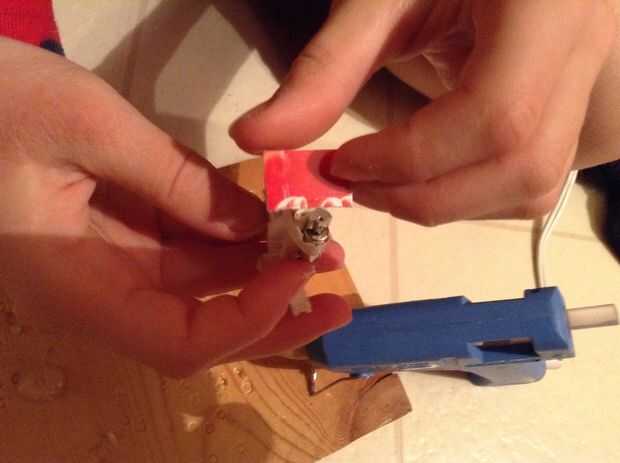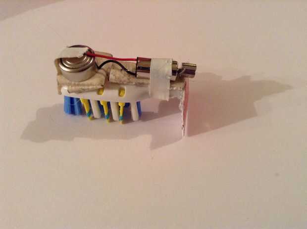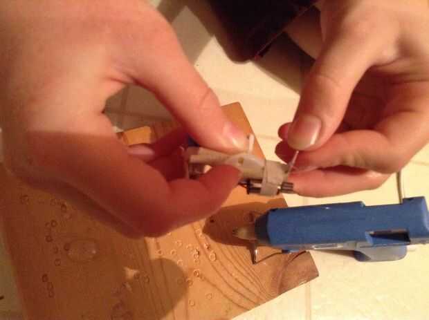 Para montar la barredora de nieve, simplemente poner glue(Note: be careful, as hot-glue is HOT!) caliente en la parte superior de la pieza de plástico y luego adjuntarlo a su TinyBot donde se haya decidido por antes. Espere hasta que se seque, luego asegúrese de que esté estable. Debería ver algo como la imagen. Si tu pala se extiende por debajo de las cerdas, su ' Bot no será capaz de equilibrar, por lo que se debe recortar en ese caso. Eso es todo! Es tan fácil como eso. Sólo tomar hacia fuera a su estera agradable o puerta y deje correr y que no sólo ven adorable, sino le ayudará con su shoveling(a little)!