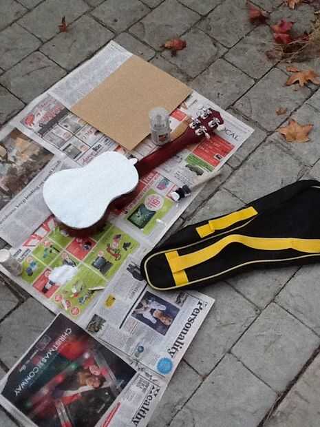 Como ya he mencionado, he optado por toda la pintura blanca, mientras que usted puede ir para algo más colorido, pero si tu ukulele es un color muy contrastante a su pintura, sugiero hacer una capa de fondo extra de pintura antes de agregar un diseño, incluso un poco las cosas. Necesitarás: 1 (una) botella de ukelele A de pintura que sería afligido por vaciado (debe ser algún tipo de pintura de la superficie de todo porque para uno no la arena antes de la primera capa, así que dudo que hubiera pegado regular pintura madera) un cepillo de espuma amplia luz de papel de lija una especie de lustre o barniz (utilicé un spray, pero creo que ninguna especie de clara capa superior tiene disponible es buena como mantendremos la pintura de rascado de.) Cualquier decoración usted querrá agregar, de más colores de pintura para cuadros, para cinta de rhinestones para pegatinas, a las plantillas y por último, un montón de periódico también Asegúrese de que llevas ropa que no una tragedia para conseguir pinta y guantes si no quieres que manos manchadas si eres un profesional, puede que desee quitar las cuerdas antes de empezar a pintar. Les dejó encendido y un poco raspado de pintura más adelante. Empecé con la parte posterior de uke, pruebas de espesor de pintura y pinceladas, a continuación, pasar a la curva fuera de ella. Para los lados del ukelele, sugiero hacer trazos cortos hacia arriba y abajo frente a unos largo hacia los lados. Es más fácil, para una cosa. Decidí dejar el cuello del ukelele como era, aunque los marcadores de color plástico acordes que se construyen en él me traicionan como novato, porque no quería quitar las cuerdas y el riesgo de estropear la funcionalidad de la misma. También salí de la parte posterior del cuello en blanco para hacerlo más fácil de sostener y acordes, además de algunos trazos inclinados en la base (Foto 3). Una vez que está pintado deje que la capa base se seque para buen rato, preferiblemente 12 o más horas, dependiendo de su pintura.