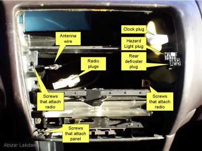 Tire hacia usted de la radio. Quite el cable de antena de la parte posterior de la radio. Quitar el par de cables conectores de arnés que van a la parte posterior de la radio presionando la lengüeta de liberación en los enchufes. Remueve la radio.