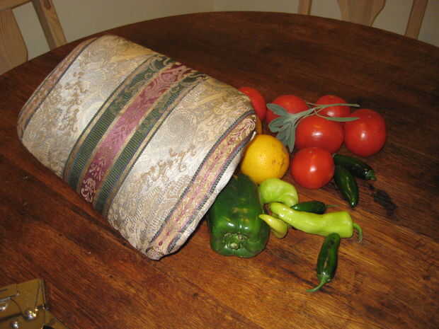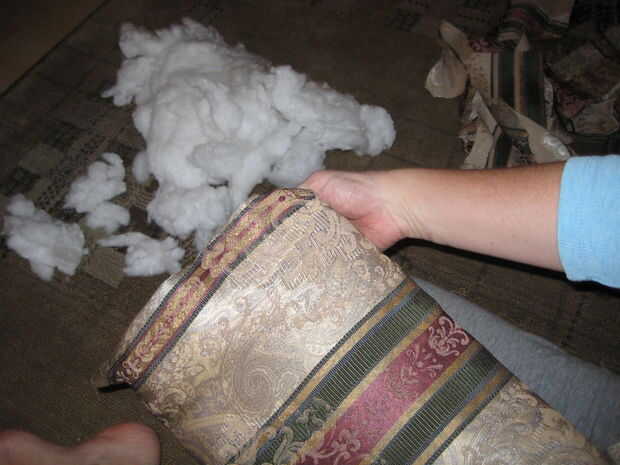 Tire hacia abajo de una de las esquinas hacia el centro de la espalda. Compruebe que se pliegue suavemente sobre la frente, luego tapa y grapa una vez en el centro de la esquina. Tirar y doblar la esquina opuesta de la grapa. No el otro par de esquinas opuestas. Cualquier tela de esquina flexible de la grapa y recorte.