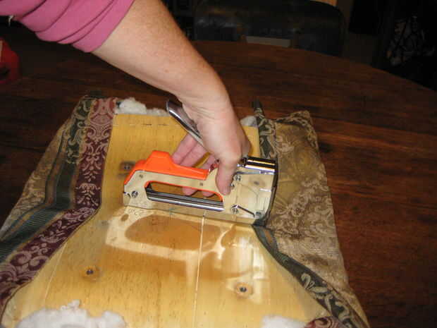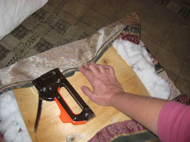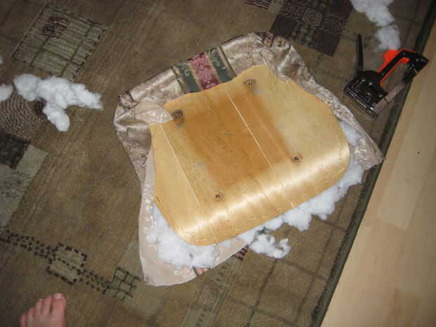 Así que tiró todas las grapas, recortado por mi plaza de tela de gran tamaño y empezar. También sacó casi la mitad el relleno, que yo había exagerado como se puede ver en la tercera foto. Esta vez, en contra de toda la sabiduría convencional, comencé en el frente de centro, que luego se trasladó a los lados, luego la espalda y esquinas.