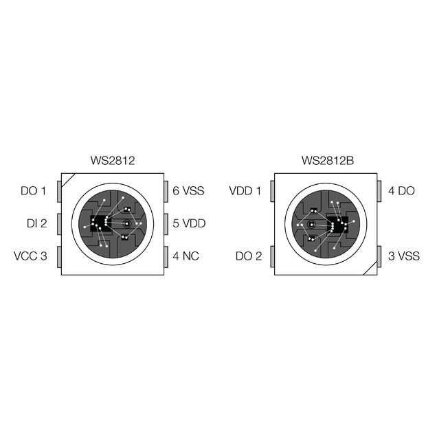 Una cosa importante a destacar es que, por razones que no podemos detallar, el diseño de la WS2812B tiene una pequeña muesca en la esquina del paquete indicando el pin 3 en lugar de pin 1! Necesitamos prestamos especial atención al soldar estos a mano, para que no orientamos el módulo como lo haríamos con ICs típico (o el WS2812, para el caso).