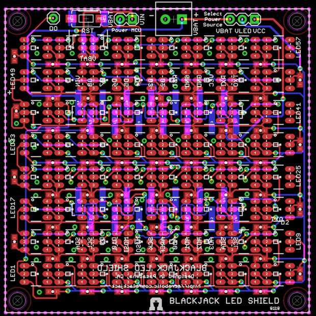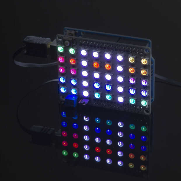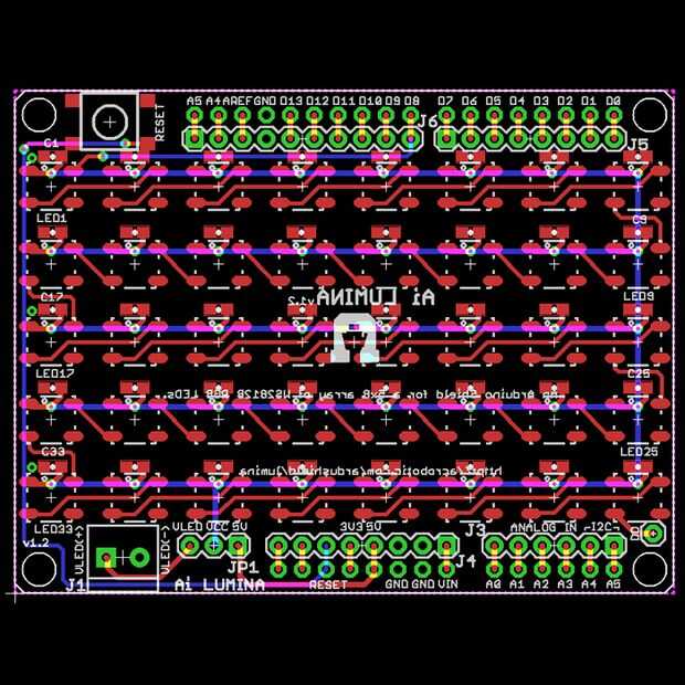 Podemos ver en las imágenes sobre cómo fácil es para una matriz de 5 x 8 para el Lumina Shield para Arduino usando estos nuevos LEDs, para la comparación, incluimos un viejo diseño de una matriz de 16 x 16 mediante WS2812s. Los archivos de diseño para el escudo de Lumina se pueden encontrar en este repositorio de Github.