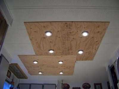 A continuación tuve que decidir donde quería las nuevas luces... Yo quería espacio hacia fuera mejor a través de la cocina y necesarios para cubrir los agujeros gaping grandes que vinieron de las viejas luces. Decidí usar una fina lámina de madera contrachapada como un soporte de la fascia. Una hoja completa sin cortar era el perfecto largo y ancho de la cocina excepto hay una despensa en el camino... Artísticamente corte y comprometidos y zona... Perfecto. Atornilla la madera en el techo donde la quería. El lienzo se encuentra, ahora tengo una buena base para las luces.