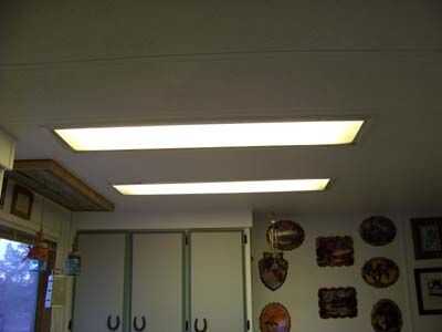 Eliminación de las luces fue fácil. Que primero sacó los tubos y encontré 4 cabeza plana tornillos en los bordes... Desenroscándolos había lanzado las suspensiones de viga del techo y las luces bajaron, literalmente. Honestamente no estaba esperando que vinieran abajo causa que no sabía cómo se celebraron allí... Tiró de las tuercas para alambre y sacó a la tienda donde probablemente ellos serán convertidas en luces de la tienda...