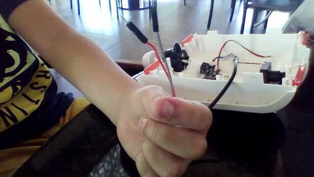 Desenroscar la cámara rover y pegado con pegamento caliente en la parte delantera del rover (el hecho de la vivienda aparecen en el feed de video) y había perforado un agujero en la parte trasera del rover y resbala la antena a través de ella y pegó el transmisor hay con cinta. (El transmisor hecho caber debajo del orificio de antena normal). Es accionado por el puerto de balance con los adaptadores de puente (hembra-macho) a 7.4V, como se muestra en la segunda foto de este paso.