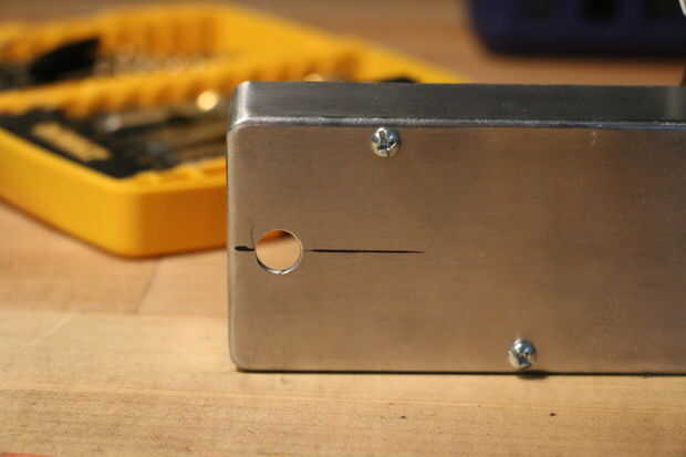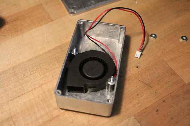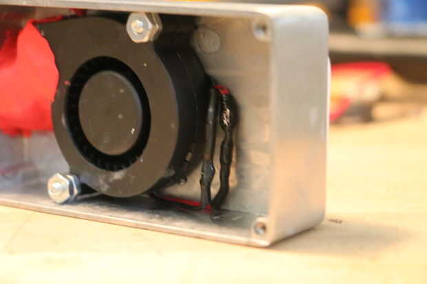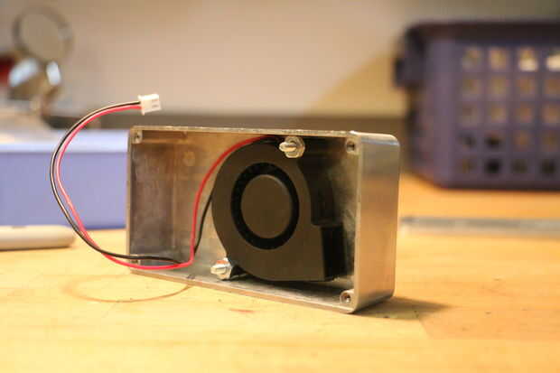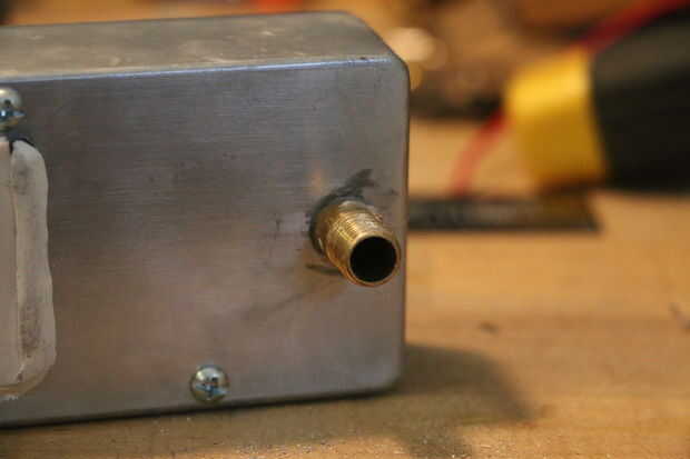 En primer lugar, perfore 2 agujeros y coloque el ventilador en la manera mencionada anteriormente. Asegúrese de no colocar demasiado bien, ya que es simplemente una etapa de pruebas. A continuación, perfore el orificio para el cobre del pezón, en la parte inferior de la caja. Taladré esto hacia fuera con un 7/16" bits y aprovechado el agujero, luego pegar para mantenerlo en su lugar. Para un agujero que empareja para el pezón, asegúrese de perforar uno de los agujeros inferiores 3/8" combustión en el interior capa de espacio tornillo adicional.