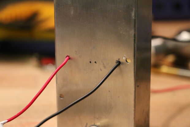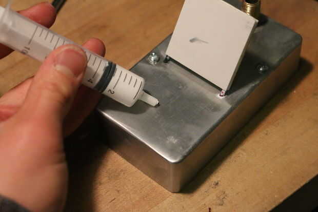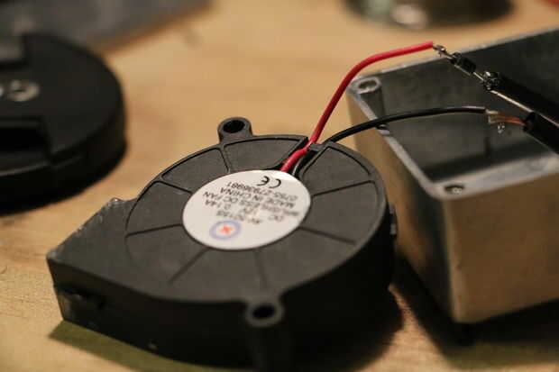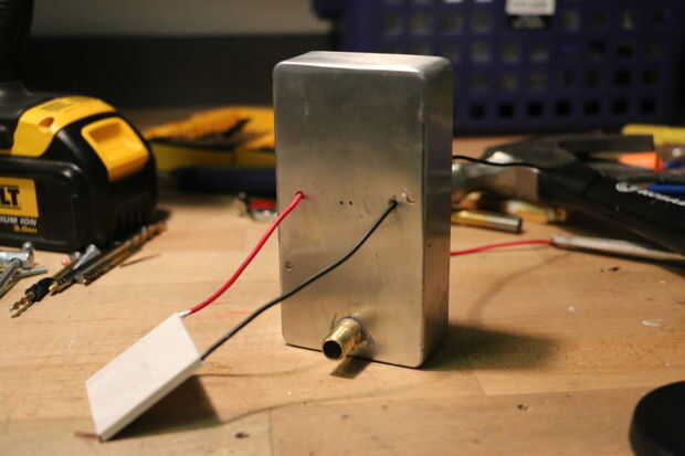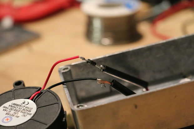 En primer lugar, perforar 2 pequeños, 1/8" un lugar para que los cables pasan directamente desde el módulo en los orificios de la caja. Luego, pase los cables dentro de estos orificios y sostener al otro lado. Ahora, fije el ventilador, rojo con rojo, negro con negro, con un diodo en el cable rojo, línea blanca hacia el ventilador. En lugar y asegúrese de que ejecutar del encogimiento del calor sobre estos cables antes de soldar completamente soldado, con el fin de evitar cortos circuitos. Caliente este tubo para el tubo del encogimiento sobre los conductores y hecho! En el exterior de la caja, tomar algunos termal compuesto y soltar un poco pegote en el recinto, exprimir esto en la nevera cuando lo coloque hacia abajo. También he añadido pequeños rollos de sugru alrededor de cada borde del módulo para mantenerlo en su lugar.