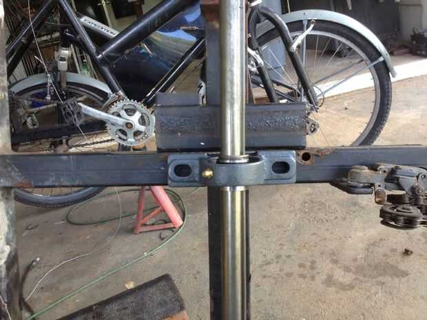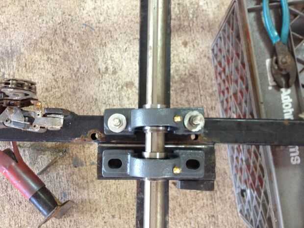 Salir el canal "C" de 7 pulgadas, esta se utilizará para construir los otros centro cojinetes de soporte de montaje - la cabina debe tener un eje de división o sería imposible convertirlo. Línea como esta y soldar en. La parte crítica de esto es que quede al ras con la parte inferior del marco de la así que todos los rodamientos están en línea. Perfore agujeros en el centro del canal con el mismo método como el último paso y montar el rodamiento final. Deje los cojinetes de dos centro flojos pero apriete a las outers así puede Deslice el eje hacia fuera.